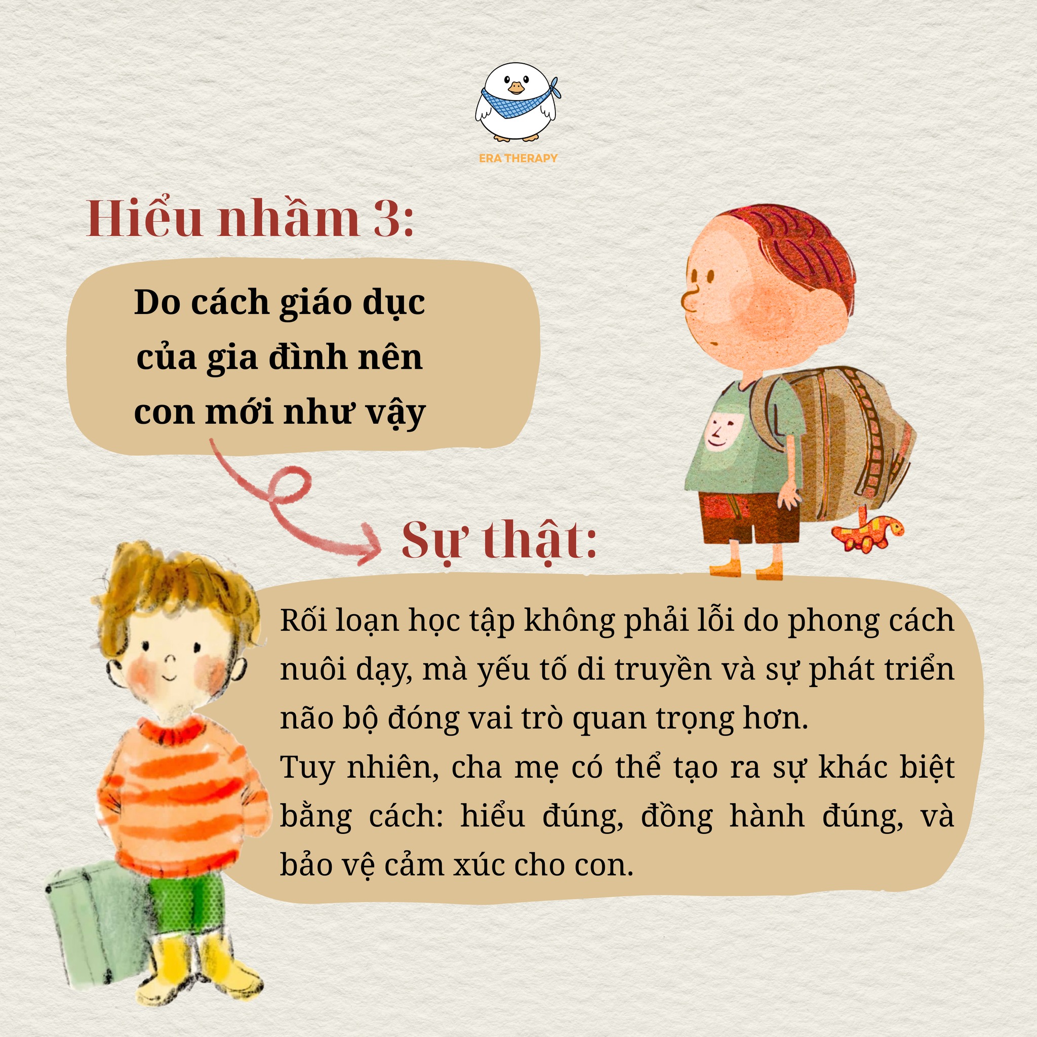 Sự thật: Rối loạn học tập không do khiếm khuyết trí tuệ, không do thiếu cơ hội học tập, không do vấn đề thuộc về giác quan chưa được điều chỉnh, mà rối loạn này có cơ sở liên quan đến vấn đề sinh học thần kinh. Khi con gặp rối loạn học tập, việc cố gắng theo cách cũ không giúp con tiến bộ. Thậm chí, việc học thêm quá nhiều có thể khiến con lo lắng, sợ học, né tránh sách vở.